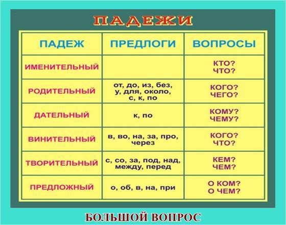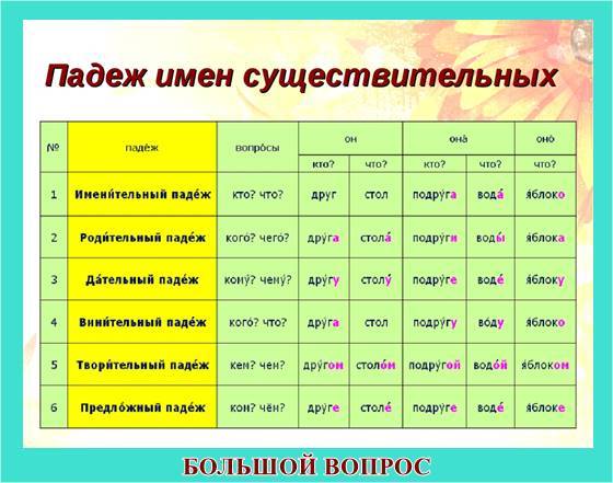 У существительных есть падеж, изменение существительного по падежам называется склонением. Выделяют шесть падежей и для каждого есть свой особенный вопрос. При изменении существительного по падежам меняется только его окончание, но основа остается неизменной.