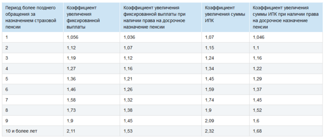 Играть роль будет не сам стаж, а время, на которое человек решит отложить свой выход на пенсию: например, женщина в 55 лет решит продолжать работу, не обращаясь в ПФР за оформлением пенсии (для мужчин, соответственно, это будет в 60 лет). Вот в этом случае количество "отложенных" лет будет влиять как на фиксированную часть пенсии, так и на ее страховую часть. Увеличивающие коэффициенты приведены в таблице: