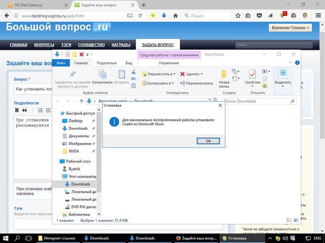 При установке скайпа выходит сообщение, что, для безопасного использования рекомен­дуется установка из магазина. Что делать?