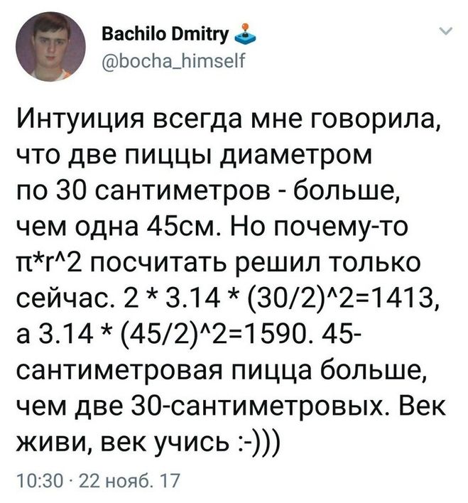 Почему одна пицца 45 см больше, чем две пиццы по 30 см?