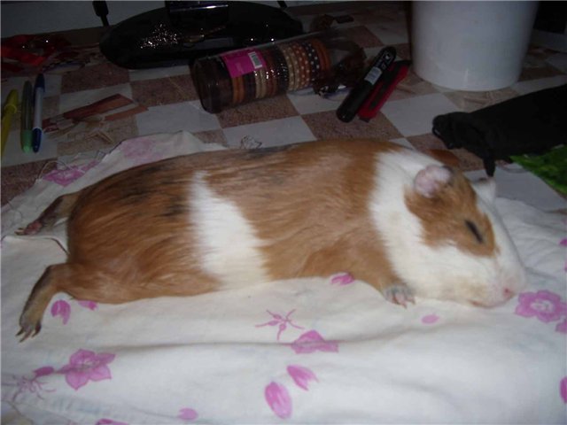 Морские свинки спят очень мало, примерно 40 минут спят, поиграют и снова спят. Таким образом за сутки сон длится примерно 4-5 часов. Свинки спят лежа на боку и в основном с открытыми глазами, это у них срабатывает инстинкт самосохранения. Когда свинка спит в тихой, привычной обстановке и не чувствует опасности, то может поспать и с закрытыми глазами.