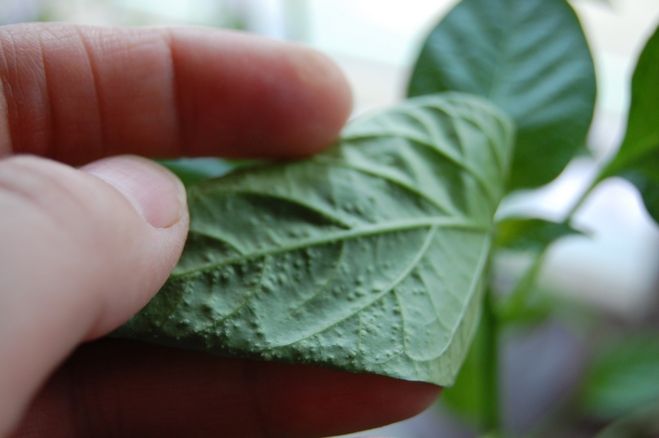 Пупырышки на листьях — элементарная водянка(эдема). Водянку не относят к заболеваниям, отчего не лечат. Данное системное нарушение появляется из-за сочетания нескольких факторов: обильного полива, прохлады и недостатка солнечного освещения. Вашему перцу сейчас холодно на подоконнике, не хватает солнышка и грунт поддерживается во влажном состоянии.