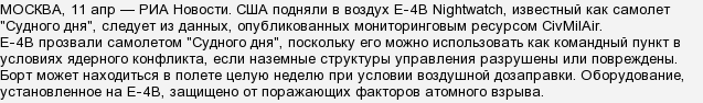 Это самолет Е-4В, "самолет судного дня" — это его прозвище, этой "ночной птички". Да, неприятненько, но пусть полетает пока над Индианой. Захотелось Трампу продемонстрировать, не знаю, какой медицинский термин подобрать, но порох в пороховницах, вообще-то это президентский самолет, где находится командный пункт.