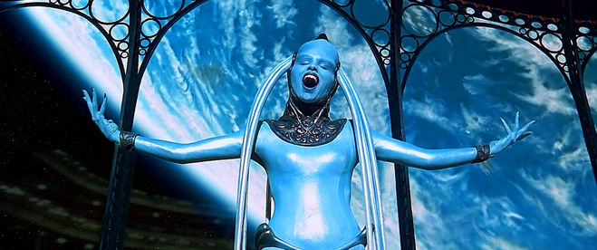 Что касается образа поющей Дивы. Хотя компьютерная графика в то время ("5 элемент снимался в 1996 году) уже использовалась в кинематографе, но в основном в Голливуде ("5 элемент" снимался на французской киностудии "Gaumont"), и довольно вяло (то есть киношные CGI пока еще только раскручивались и набирали обороты). Хотя, конечно, в "5 элементе" футуристические виды города грядущего сработаны частью с помощью компьютерной графики и анимации, частью — с применением миниатюр (М 1:24).