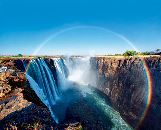 Кстати, на снимке это демонстрируется это вполне отчётливо: скала на ближнем плане заслоняет зону, в которой присутствуют водяная взвесь, поэтому у радуги возникает левый край, а правый край оказывается на фоне сравнительно светлой воды, и радуга там есть — но просто не видна.