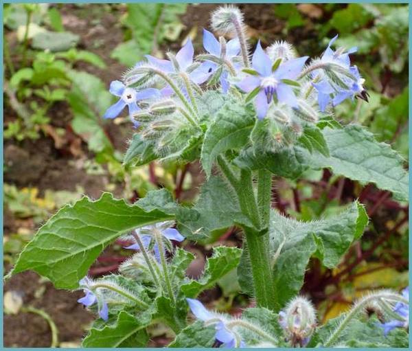 Это Огуречная трава, она же Бурачник. Имеет огуречный вкус и запах. Огурцы на ней, конечно, не растут, но в салаты она идет великолепно. Кроме того, считается лекарственной. Хоть и считается однолетней, но у меня расползлась по всему огороду и особенно любит капусту.