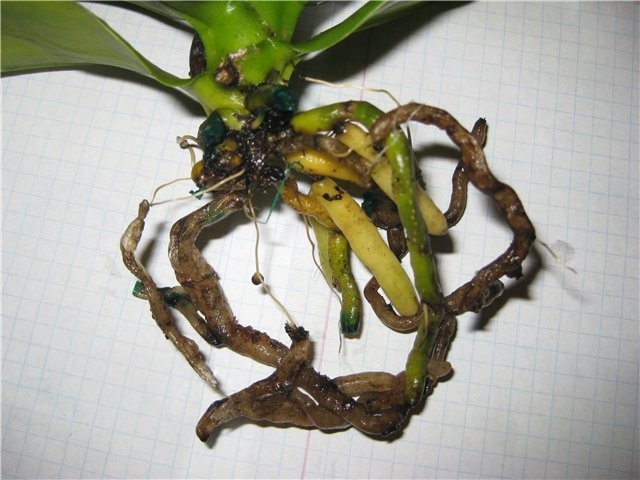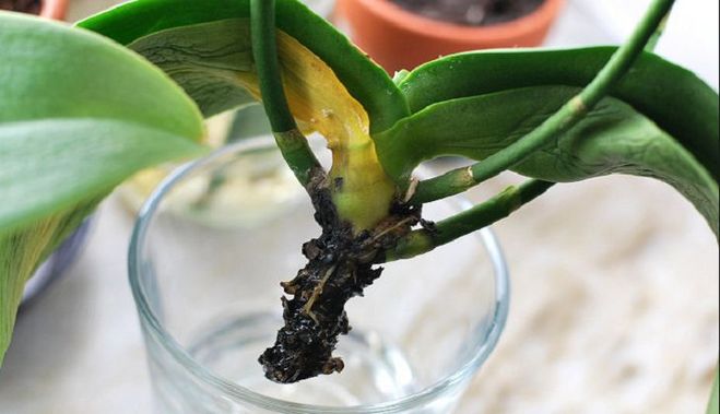 Обычно в подобных случаях на предмет гнили осматривают корни на наличие подозрительных коричневых или черных пятен. Много отмерших корней также должно настораживать. Если есть подозрение на болезнь корней, тогда растение достают из горшка, удаляют с захватом здоровой ткани больные или отмершие части. Присыпать ранки толченым углем или корицей не нужно, так как следить за возможным дальнейшим развитием грибка будет сложно. Обязательно осматривают сам стебель. Здоровый стебель зеленый, наличие черных пятен опять же ведет к их удалению. Порой при реанимации фаленопсисов остается лишь розетка без корней, которые наращивают в тепличке(в закрытом прозрачном контейнере с повышенной влажностью воздуха). Я Вам советую также осмотреть корни: сначала через стенки горшка, при необходимости удалить все больное. Сами листья также следует удалять полностью с основанием, которое охватывает стебель.
