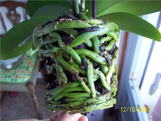 здоровые корни фаленопсиса(на фото они после полива) — не имеют подозрительных вкраплений, отмерших частей, целиком оплетают пространство горшка