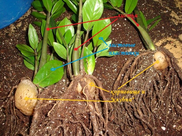 У замиокулькаса нет веток: вся наземная часть представлена сложными листьями, а подземная — сочным корневищем с утолщениями, похожими на клубни(видоизмененные стебли).