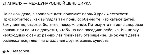 Невзоров, которого Вы процитировали, — болтун, каких мало! От его цитаты разит какой-то убогостью. Этот чудак на букву «м» пропагандирует свободу лошадей от людей. Читали?