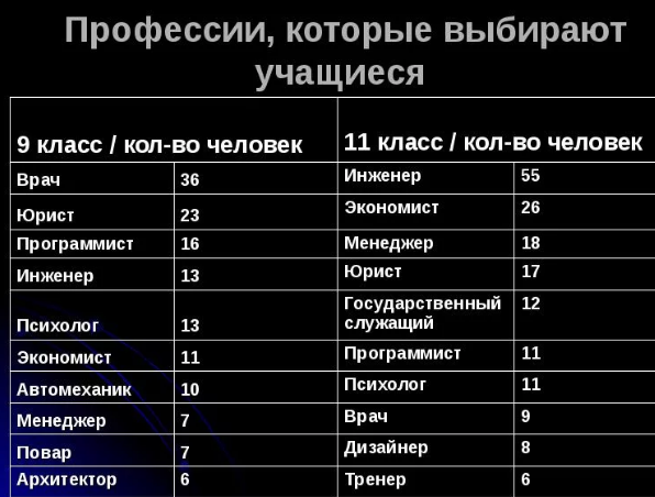 И ещё небольшая таблица, где пытаются определится в своей профессии, дети 9-ых и 11-ых классов. Можно чётко увидеть их предпочтения.