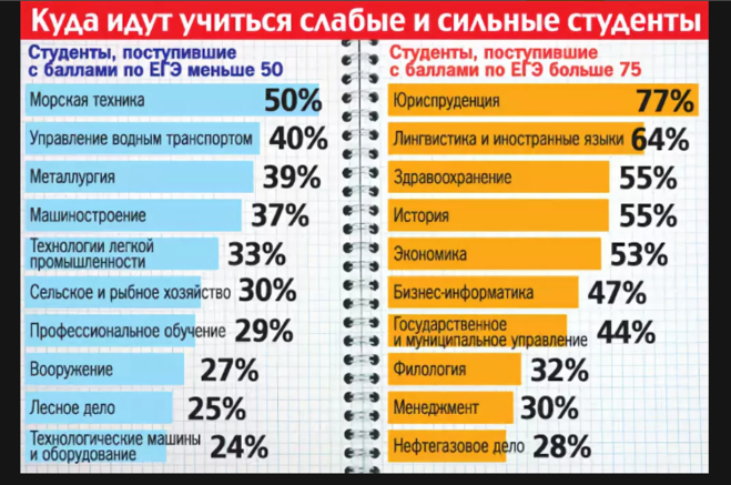 Современные выпускники сейчас часто выбирают профессии, на которые можно выучиться бесплатно. Бесплатно пока учат в медицинских институтах, в технических вузах. Туда молодежь и устремляется. Если совсем недавно всем хотелось быть юристами и экономистами, то сейчас это тенденция изменилась. В гимназии, где учился сын, а сейчас учится дочка, еще лет 5-10 назад переполнены были классы историко-правоведческий и экономический. Зато на физмат и на биохим набиралось только по 10-15 человек, поэтому их объединяли в один класс. Сейчас большие конкурсы в физмат- класс и биохим, на экономику заявляется по 5-7 человек. У нас так.