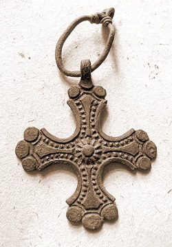 Судя по потертостям, подвеска носилась птичкой к телу, двузубцем наружу. Археологи считают, что изображение ключа символизирует регентство княгини Ольги. Подробнее здесь. В том же захоронении был найден нательный крест.