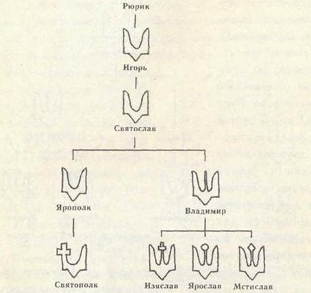 Трезубец по образцу Владимира также использовали его сыновья Изяслав и Мстислав. Другие князья из рода Рюриковичей лишь до конца XI века пользовались хазарской тамгой, но уже в измененном виде: двузубцы, плавные линии и т.д.