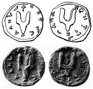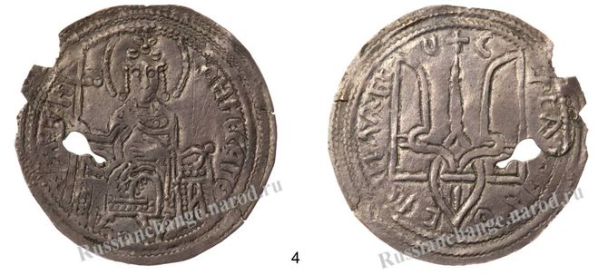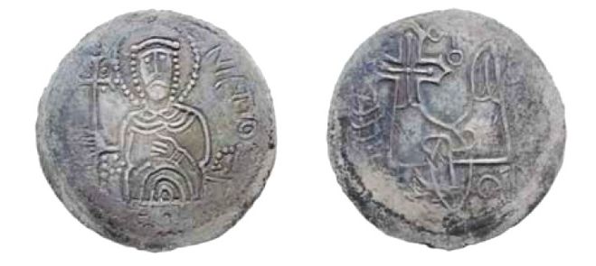 На монете Ярослава, крещеного под именем Георгий, на аверсе изображение святого Георгия, на реверсе — трезубец: