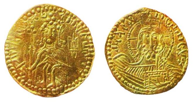 Известны монеты того периода: золотник и сребреники Владимира. На лицевой стороне изображен сам князь. На золотнике в правой руке он держит крест, левая — на груди, возле левой руки расположена хазарская тамга (трезубец). По кругу надпись "Владимир на престоле". На реверсе монеты изображен лик Иисуса Христа.