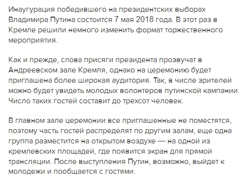 Есть информация, что на эту церемонию будет приглашена немного более свободная аудитория. Говорят, что, в числе почетных зрителей можно будет узреть молодых волонтеров, которые участвовали в путинской кампании. Приблизительное число подобных гостей будет до 300 человек.