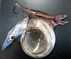 Мешкоглот, он же чёрный пожиратель. Сможет хомячить рыбу больше себя самой в четыре раза и тяжелее себя в десять раз. Она имеет эластичный желудок и не имеет рёбер. Челюсти большие, нижняя не соединяется с головой костно, посему варежку может открыть большую). На каждой челесте есть три клыка, с помощью которых удерживает добычу. Во время переваривания пищи у рыбы образуются газы, которые ее поднимают наверх. Обитает на глубине 700—3000 метров. Размножается путём откладывания яиц.