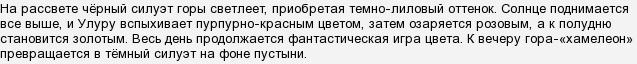 Она древняя(680 млн.лет),она оранжево-коричневого цвета,песчаник,из которого она состоит,придает ей уникальное свойство — менять цвет,на рассвете она кажется темно-лиловой,днем — золотисто-песчаной,а вечером становится очень темной..считается священной