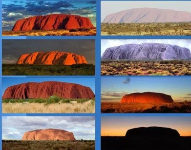 На континенте Австралия есть необычная гора под названием Улуру. В основании горы находится множество пещер с наскальными рисунками и резьбой. Но не это делает гору Улуру такой известной и привлекательной для туристов. Дело в том, что данная гора состоит из красного песчаника и благодаря этому гора меняет свой цвет в зависимости от времени суток.