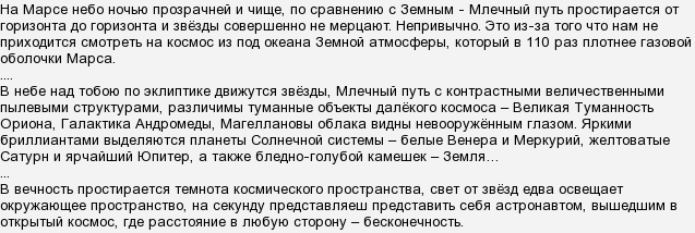 Правда, из-за разряженной и безвктренной атмосферы, вид на звездное небо будет намного выразительнее и потряснее, как в темную и безветренную земную ночь в удаленной от города местности: