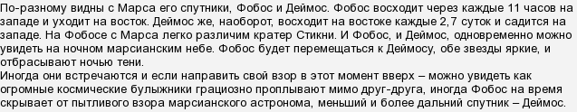 Также можно ориентироваться по Деймосу и Фобосу. Их на марсианском небе не заметить трудно: Деймос выглядит как маленькая луна (треть диаметра нашей Луны), Фобос — как супер-яркая звезда, напоминающий по светимости Венеру с Земли. Иногда они "пересекаются":