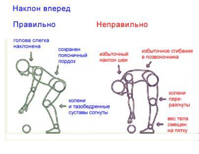 • Внимание! Принципиально! Наклоняемся никогда н ев пояснице, сгибая спину — а в тазобедренном суставе. Спина при этом не "ломается", не гнется, а именно наклоняется