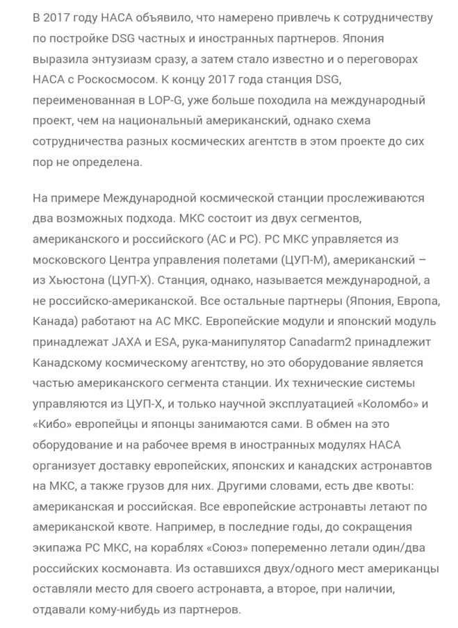 Все эти разговоры про окололунную орбитальную станцию абсолютно пустые разговоры. Все ограничивается намерениями, но пока нет даже проекта самой станции, все отдельные узлы пока в лучшем случае на стадии проработки вариантов и даже в чем будут космонавты защищаться от космической радиации на этой станции пока принципиально не решено. Из всех публикаций в СМИ становится понятно, что пока это чисто рекламный проект НАСА, который пытается "пристроить" будущий сверхтяжелый РН, на который уже потрачены очень не малые даже по американским меркам средства из госбюджета, а отдачи не предвидится. Пока все эти рекламные заявления не находят конкретных "лопушков", готовых вкалывать на "американскую мечту" быть всегда и везде первыми. Якобы участники "проекта" — это европейское космическое агентство, индусы, японцы и…. пока всё! Ни китайцев, ни русских пока в этот проект не затянули и слава богу! Возможно русские с китайцами, пусть не скоро, но смогут договориться о космическом сотрудничестве в освоении Луны, но все это будет очень не скоро, скорее появится военная космическая база на Луне, чем научная станция.