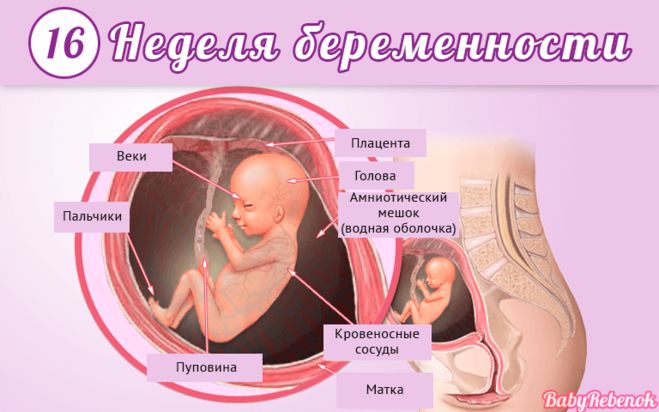На 16 неделе малшыш весит приблизительно 80-100 г, а его рост колеблется в пределах 10-12 см. По размеру он похож на небольшое авокадо или средний помидорчик. Уже сформировалась система кроветворения и можно определить группу крови и резус. Малыш уже держит головку прямо и может вертеть ею из сторны в сторону. Начинают постепенно работать кишечник, желчный пузырь и печень. Также работают почки и мочевой пузырь, малыш начинает ходить "по-маленькому" и делает это довольно часто — примерно каждые 45 минут. Однако повода для беспокойства нет. Околоплодные воды меняются около 10 раз в сутки и абсолютно стерильны. Половые органы четко диференциированы и на узи будущим родителям уже уверенно скажут пол малыша.