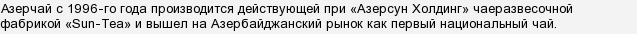 Совсем недавно моя подруга ездила в Баку и привезла мне оттуда пачку Азерчай. Вкусный чай с ароматом бергамота. Этот настояший азербайджанский чай производит компания «Sun-Tea», входящая в состав «Азерсун Холдинг» Эта компания была открыта Гейдаром Алиевым в 1996-ом году.