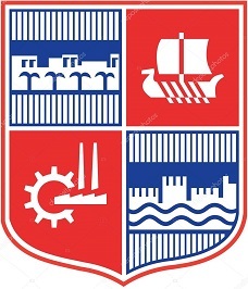 Герб города — древний корабль, крепостная стена, морские волны и современная промышленность.