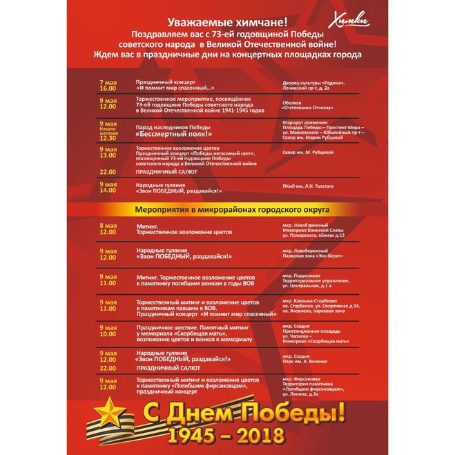 В честь 73-й годовщины Великой Победы в Химках пройдет масса мероприятий, всего будет их более 100. Самым масштабным станет шествие Бессмертного полка. Начало в 11-30 у обелиска "Отстоявшим Отчизну". После возложения цветов и митинга колонна двинется по улицам города. Вот полная программа (источник):