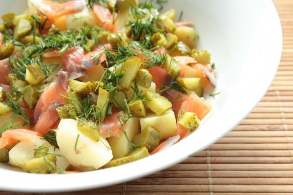 Отварной картофель 5 шт. (мелкий), слабосоленый лосось (50 г.), маринованные корнишоны (5 шт.), укроп (2 веточки), соль (по вкусу), для заправки салата оливковое масло (2 ст.л.), дижонская горчица (1 ч.л.), лимонный сок (1 ч.л.).