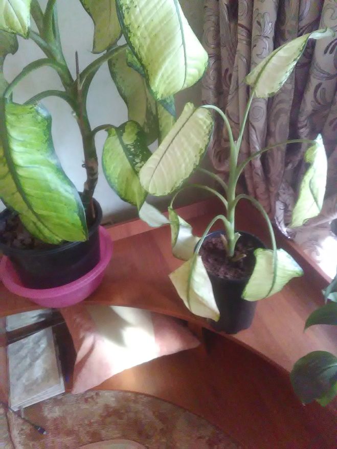 Есть несколько причин потери окраски листьев диффенбахии. Бледные поникающие листья диффенбахий могут говорить о слишком интенсивном освещении, перегреве корневой системы, периодических пересушках грунта, недостатке азота в питании. Стоит поразмышлять: что же может быть именно с Вашей диффенбахией.