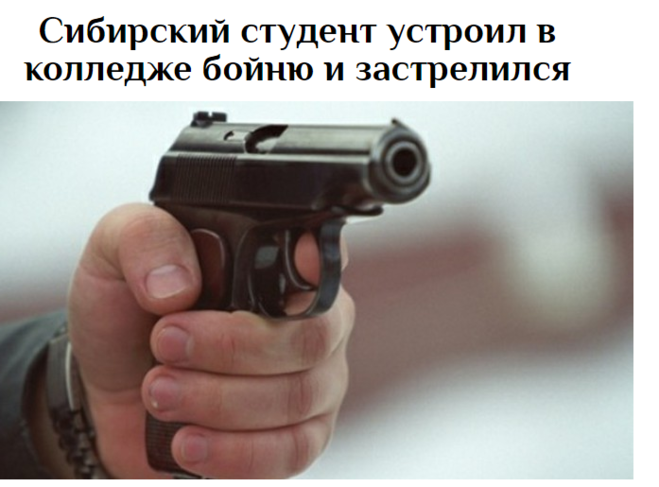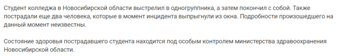Стрельба в колледже произошла сегодня утром в городе Барабинске Новосибирской области. 17-летний студент первого курса принес ружье из дома (оно зарегистрировано на его отца), собрал его в туалете, а на занятиях выстрелил. Один ранен, двое получили травмы, так как стали выпрыгивать из окон. Сам нападавший застрелился.