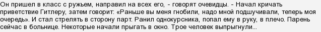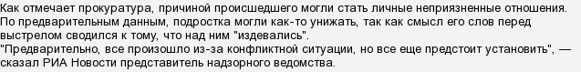 Как стало известно, это была расправа с ребятами за подтрунивания с их стороны и какие-то издевательства. Одного она ранил, а двое других, спасаясь выпрыгнули из окна, получив серьезные травмы. Сам стрелявший покончил с собой.