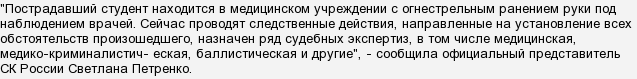 Студент,в которого стреляли ,сейчас находится в больнице ,так же есть еще два пострадавших — они выпрыгнули из окна и получили различной степени тяжести ушибы и переломы.
