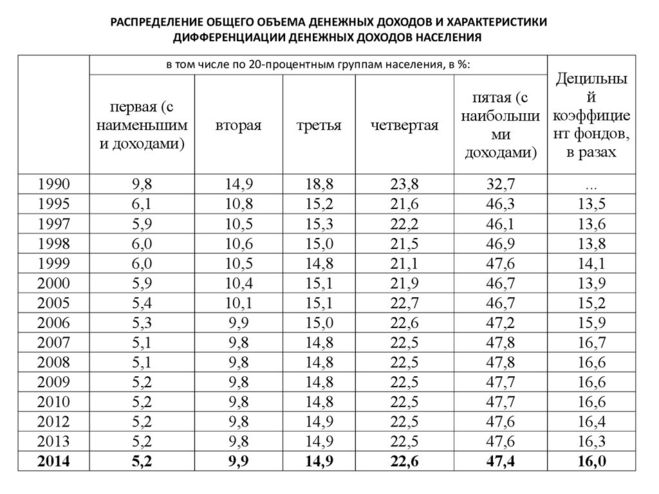 Но из приведенных таблиц понятно следующее: доходы 20 % самых богатых людей России выше почти в 16 раз доходов 20 % самых бедных людей по состоянию на 2016 год.