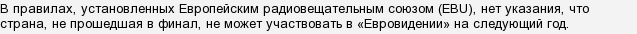 Правилами EBU (Европейский теле-радиовещательный союз) не запрещается участие какой-нибудь страны в музыкальном конкурсе из-за того, что страна не вышла в финал.