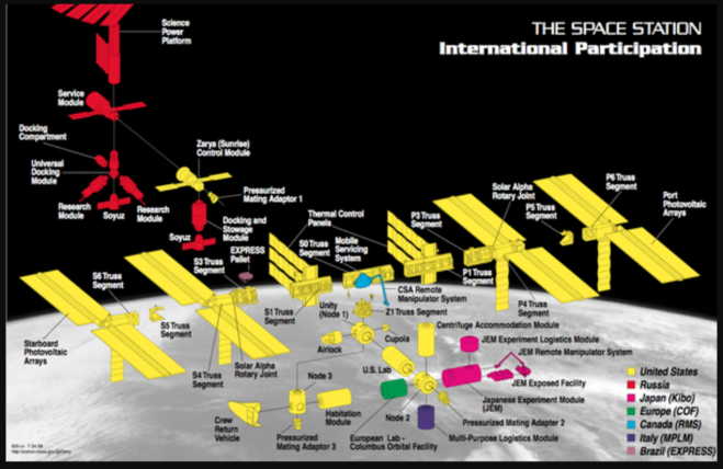 Несмотря на многочисленный состав стран — 14 членов программы МКС, станция юридически разделена только на два сегмента — российский (красным цветом на рисунке) и американский (всё остальное).
