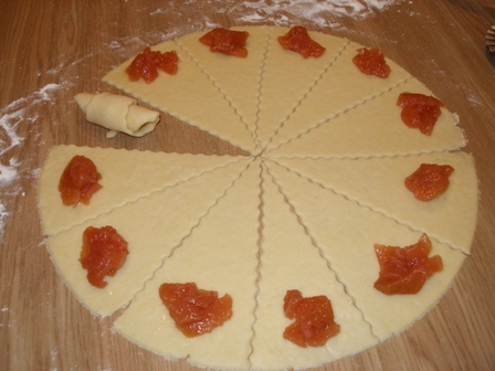 Я рогалики делала с вареньем, только промазывала тонким слоем весь треугольник и скручивала, потому что вытекает варенье и так и так, но мне вкуснее когда полностью промазан