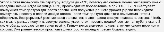 Укроп же и вовсе можно засеивать при температуре уже +3 градуса по Цельсию, а вообще выдерживает температуру до -4 градусов. Вот такая неприхотливая, богатая витаминами и полезными веществами, огородная культура.