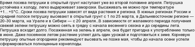 Конкретнее о петрушке. Время её посева в открытый грунт примерно середина весны, то есть апрель месяц, причём даже при довольно низкой температуре, например от +1 градуса по Цельсию до +5 градусов.