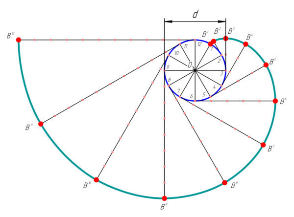 Эвольветна окружности — это спираль с постоянным шагом, то есть расстояние между витками не изменяется.