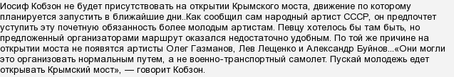 Кобзон и другие артисты не принимали участие в открытии Керченского моста по причине того, что маршурут оказался неприемлимым для них. В частности, им предложили добираться до места на военно- транспортном самолёте.
