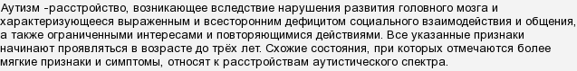 Дети с таким расстройством плохо воспринимают речь и вообще у них слабо развиты центры, отвечающие за социальную адаптацию. С виду они очень похожи на обычных детей — такие же симпатичные, подвижные, могут танцевать и даже петь, но без речи. Одним из признаков является то, что они к 2-м годам не произносят даже простых слов. Чтоб из аутиста вырос нормальный ребенок, с ним надо заниматься по специальным методикам и водить в специальный садик.