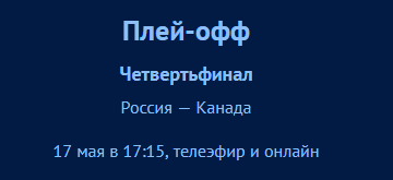 Проиграв в группе последний матч сборной Швеции, хоккейная сборная России заняла второе место вслед за шведами и вышла на сборную Канады в 1/4 финала, чем осложнили свой путь к победе в этом чемпионате мира, потому что это может стать последним матчем в Дании. Матчи с канадцами всегда принципиальные, несмотря на состав, предыдущие игры, отсутствие ведущих игроков. Поэтому предсказать, чем эта игра закончится, очень трудно. Трансляцию матча можно посмотреть по Первому каналу или по следующей ссылке начиная с 17.15 по московскому времени 17 мая.