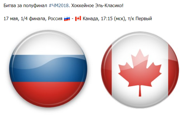 17 мая 2018 года будет проходить встреча между сборной России по хоккею, которая заняла второе место в своей группе и сборной Канады по хоккею, которая заняла первое место в своей группе, в рамках матча Чемпионата мира по хоккею с шайбой 2018 года.