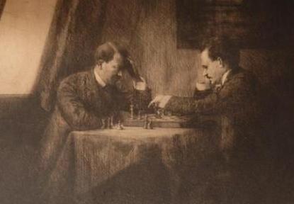Существует скандально известная картина чешской художницы-графика Эммы Лёвенштамм, написанная ею в 1909 году «A Chess Game: Lenin with Hitler — Vienna 1909». На которой изображен Адольф Гитлер, играющий в шахматы с Лениным. Эмма утверждала, что эта встреча происходила у них дома в Вене. Гетлер тогда, в 1909 году, брал у неё частные уроки живописи. А Ленин просто снимал жилье в их доме. Большинство искусствоведов, датирует офорт более поздним временем и не признаёт возможности подобной встречи в действительности. А поверите ли вы данному офорту, решать только вам.