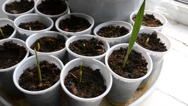 Семена любых пальм изначально следует высаживать в отдельные емкости, например, в одноразовые стаканчики и то, что Вы используете при выращивании рассады. Пальмы очень остро реагируют на повреждение корней в любом возрасте, поэтому их стараются пересаживать аккуратной перевалкой, что возможно лишь при отдельном выращивании. В одном горшке финик обыкновенный, что у Вас в горшке, — пальма крупная, для хорошего роста ей нужен простор и отсутствие конкурентов, поэтому рассаживать сеянцы придется в любом случае.